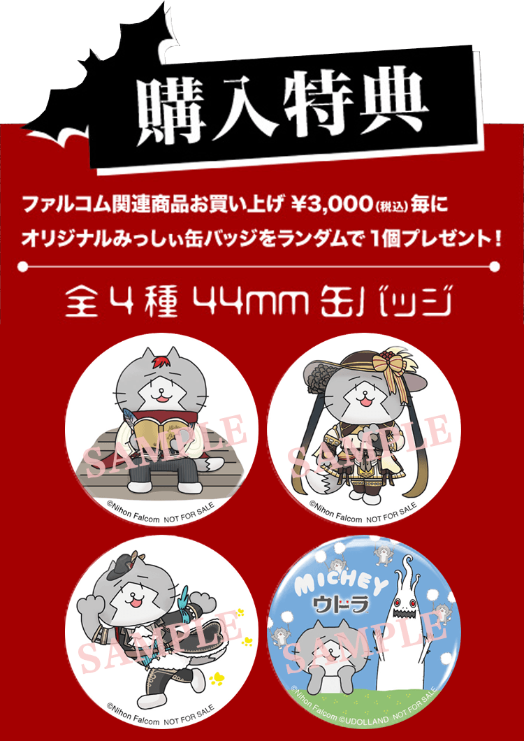 イベント期間中、ファルコム関連商品3,000円お買い上げ毎に、限定缶バッジを1つプレゼント!イースIXのアドル/白猫/人形の衣装をまとった【ゆるみっしぃ】3種と、立川市公認なりそこねキャラクター【ウドラ】&【ゆるみっしぃ】のコラボデザイン1種、計4種をご用意。