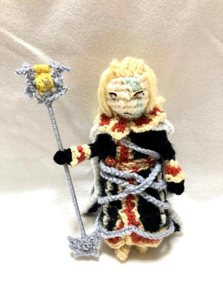 ゼクスト様のゲーム内の雰囲気も漂いつつ、でも編みぐるみのやわらかさも相まって、妖精さんサイズでとてもかわいいです。細かいベルト部分も黄色と赤茶色が混じって再現されていて感服!