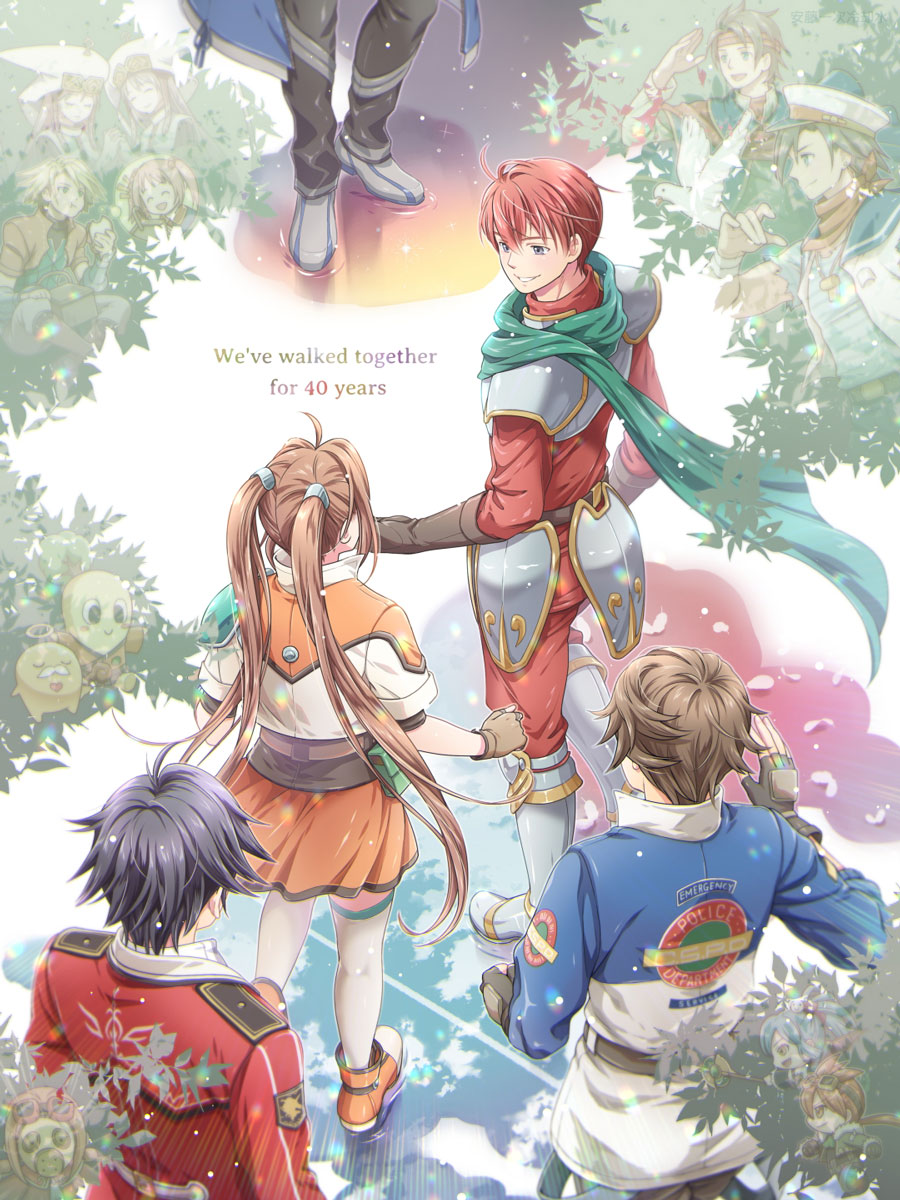 アドルと軌跡主人公たちを、そっと他タイトルのキャラたちが囲んでいて、40年を一緒に”歩んできた”キャラたちが非常に愛おしく、また一緒に歩んできてくれたファンの皆さんにも感謝の気持ちが溢れてくる素敵な作品です!(パリンのガスマスク姿には笑ってしまいました)