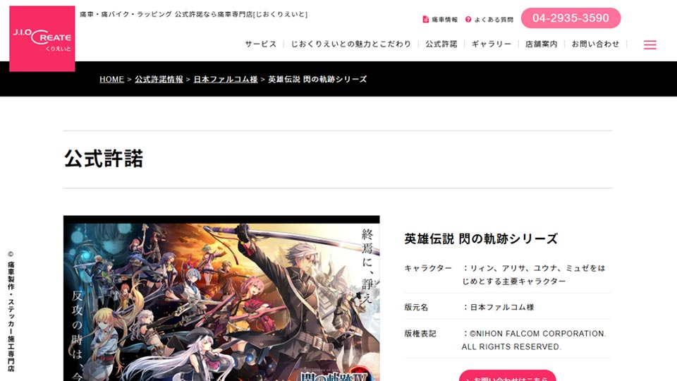 『閃の軌跡シリーズ』のイラストを使用した車、バイク、自転車などの痛車施工が行えます。